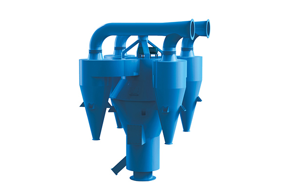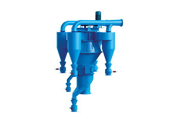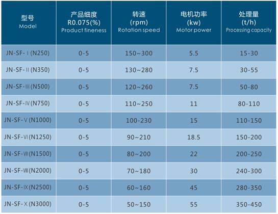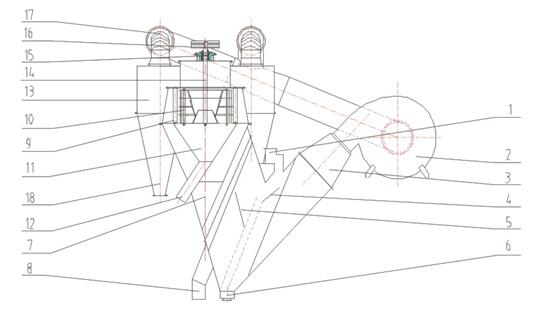 通過(guò)破碎機(jī)、制砂機(jī)、振動(dòng)篩后制成0~4.75mm的人工砂,使用輸送設(shè)備從本機(jī)喂料口喂入,進(jìn)入打散區(qū),在若干組導(dǎo)流板與若干組反擊板的作用下,不同粒徑的砂在下落過(guò)程中,砂粒產(chǎn)生不同的下落速度,使砂粒與砂粒之間產(chǎn)生數(shù)次相對(duì)磨擦,這樣砂粒表面的泥粉和石粉被剝離開來(lái),在風(fēng)力作用下迅速離開砂的表面,這樣就能將砂充分地清洗干凈。 入口1進(jìn)來(lái)的物料經(jīng)多級(jí)打散板4打散、剝離,各打散板之間從左側(cè)吹來(lái)的風(fēng)將料流中的中粗料及細(xì)料吹離,粗砂從底部粗砂出料口6排出。懸浮于氣流中的物料隨風(fēng)進(jìn)入分級(jí)區(qū)的多層分級(jí)板5之間,分級(jí)板將懸浮于氣流中的物料進(jìn)一步去除相對(duì)較粗的物料,粗料沿分級(jí)板下滑,被風(fēng)再次吹起,反復(fù)分選,后粗粉并入粗砂。出分級(jí)板的風(fēng)帶料進(jìn)入中料分級(jí)區(qū),在中料分級(jí)區(qū)由于氣流減速,方向偏轉(zhuǎn),產(chǎn)生中砂的重力沉降和撞擊器壁而沉降,中砂從中砂出口8排出。氣流帶料進(jìn)入細(xì)料分級(jí)區(qū),在細(xì)料分級(jí)區(qū),在弧形導(dǎo)流板9作用下產(chǎn)生旋轉(zhuǎn),形成離心沉降和重力沉降雙重作用,細(xì)砂落入下方細(xì)砂集料錐11,由細(xì)砂出口12排出。粉料隨氣流進(jìn)入脫粉區(qū),在籠形轉(zhuǎn)子10的作用下甩出稍粗料(細(xì)砂),細(xì)砂撞擊弧形導(dǎo)流板落入細(xì)砂收集錐,含粉氣流進(jìn)入旋風(fēng)筒進(jìn)行氣固分離,分離出的細(xì)粉由粉料口18排出,較為干凈的空氣經(jīng)出風(fēng)管17進(jìn)入風(fēng)機(jī)循環(huán)使用。