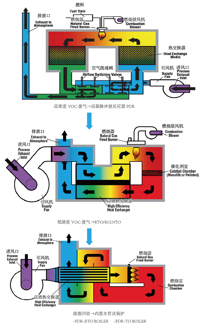 PDR專利技術(shù)能夠很好的與傳統(tǒng)的RTO/RCO/TO等傳統(tǒng)技術(shù)結(jié)合,達到同時處理高濃度低流量,低濃度高流量以及含有粉塵顆粒等雜質(zhì)的氣體;同時本公司開發(fā)的兩種專利鍋爐能夠回收熱能產(chǎn)生蒸汽提高經(jīng)濟效益。 高溫脈沖波反應器的整合技術(shù)應用 ![]() |
